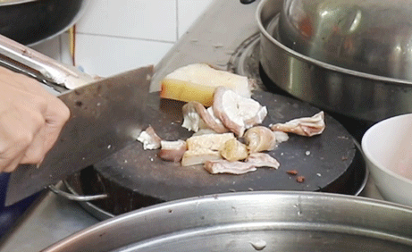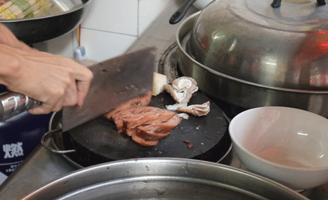老板娴熟的刀工把莲藕、白切猪肉等切块
