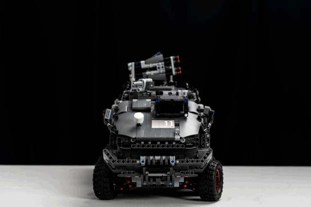 和电影中有一丢丢的不同,就是他只能4个轮子一起转……不过加上6轮驱动,这也不妨碍它的帅气就是了。