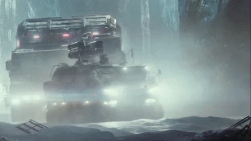 电影里运兵车上装备的左右两座8联装通用导弹发射器(类似于美国LAV-AD防空导弹发射车的武器系统),在拦停运输车后进行了目标锁定。