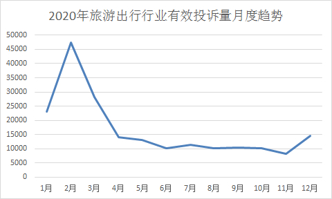 从投诉量月度走势看,2020年旅游、出行、住宿行业的投诉量于2月份达到峰值,有效投诉超4.5万单,因疫情影响的退票退款成了投诉的主要原因。