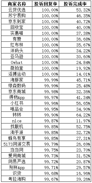 2020年黑猫投诉平台累计有效投诉量≥500件的商家,按其中回复率排序前三十纳入排行榜为: