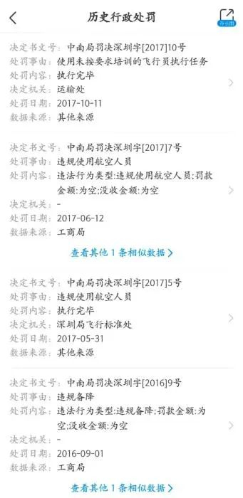 东海航空年纪虽轻,但在违规方面却一点不少。2016年以来,东海航空已经受到民航中南地区管理局多次行政处罚,包括“违规使用航空人员”“违规备降”“使用未按要求培训的飞行员执行任务”等。