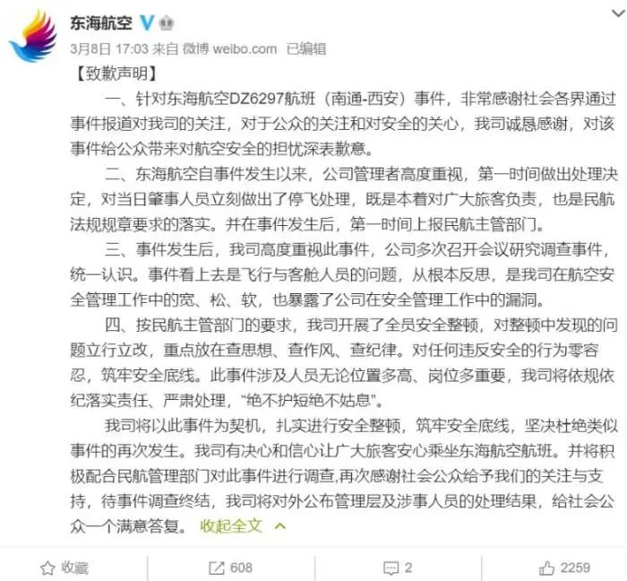 3月8日下午,东海航空再次发博致歉,称已经在事件发生后第一时间上报民航主管部门,并表示将依规依纪落实责任、严肃处理,绝不护短绝不姑息。
