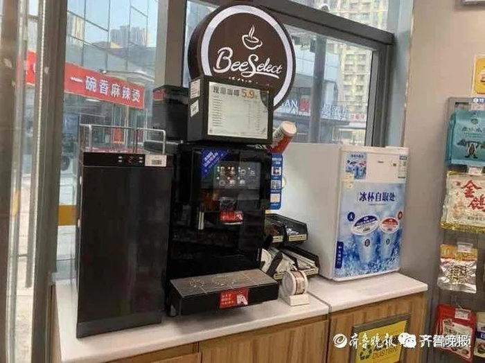 顾客一进入便利蜂,店员都会主动打招呼。在便利店靠近出口处,设置有一个操作台:咖啡机、放咖啡冰杯的冰柜、微波炉等物品一应俱全。