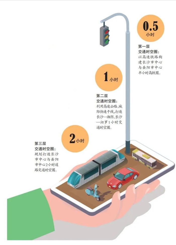 第三层则是规划打造长沙市中心与岳阳市中心2小时道路交通时空圈。