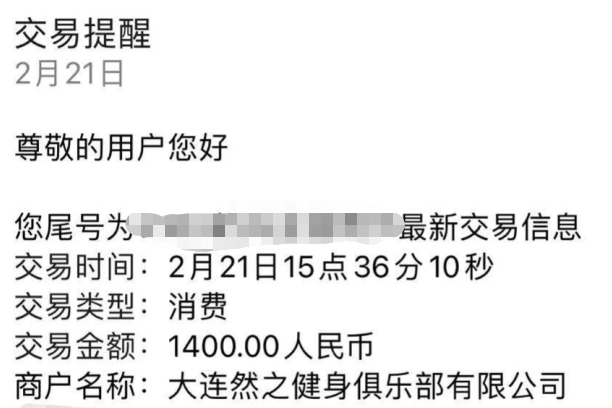 聊天记录显示,2月21日,在店长的主动询问下,韩先生再次前往,并于当天办理了年卡,1400元费用进入了名为“大连然之健身俱乐部有限公司”的帐户。