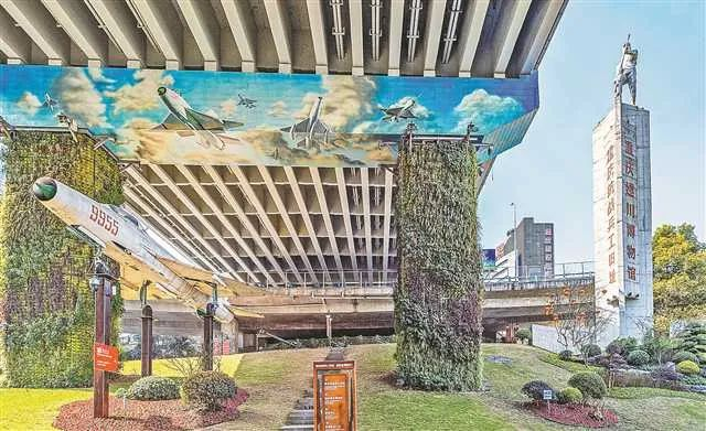 主题雕塑“冒着敌人的炮火”威严屹立在大桥边,那是一位川军战士手握机关枪,眼神坚定,正朝空中扫射日军战机,这象征着勇敢和胜利。