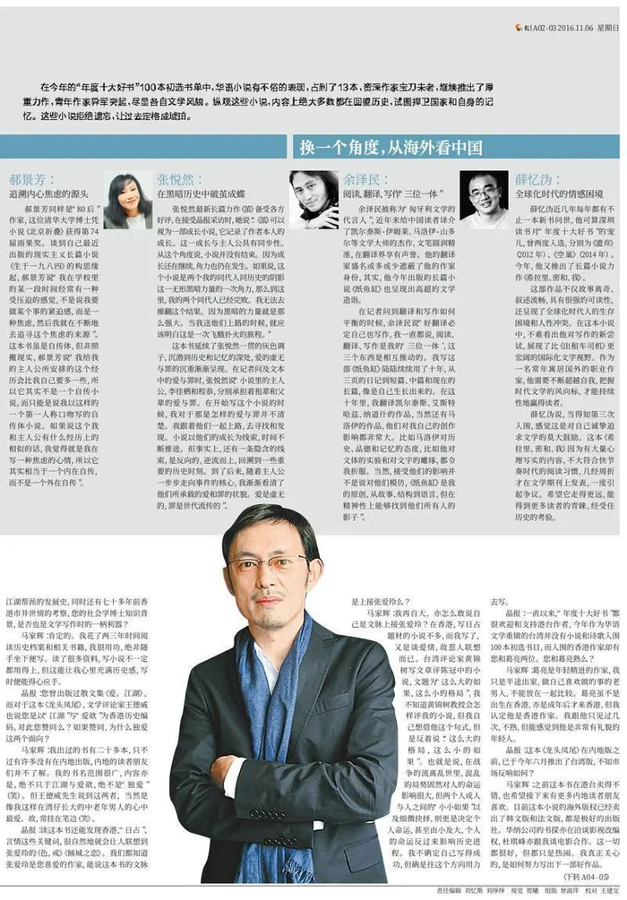 马家辉也多次接受晶报深度专访。2016年,53岁的他推出自己的第一本长篇小说《龙头凤尾》,晶报对其独家专访,详细记录了他的写作心路历程。在这次专访中他提到为什么到50多岁才决心写小说的理由:他写过超过三十年的专栏,却没被当作是作家。“似乎没有小说、长篇小说、诗这样纯粹的文学创作,作家的身份就没那么确凿、纯粹。所以我就犯了不服气的脾气了。”