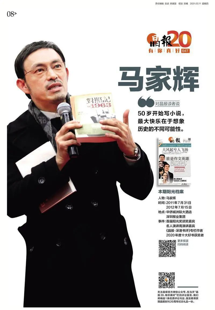 其中,马家辉还是晶报《对照记@1963》专栏的作家之一,来自香港的他与台湾的杨照、大陆的胡洪侠,三位同生于1963年、却有着不同成长经验的作家,每周选取一个50年来最常用的日常词汇作为主题词,各写一篇,相互对照,共同书写公共话题中的私人记忆,是谓晶报“对照记@1963”专栏。