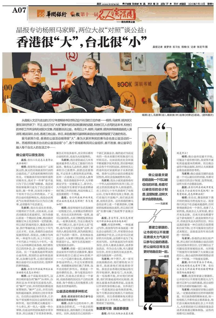 2012年7月15日,马家辉与杨照、胡洪侠共同登台晶报名人演讲周,分享台湾、香港和大陆不尽相同的公益经验。三人是多年的老朋友,又同为晶报《对照记@1963》专栏撰稿,谈起公益这个话题仍是默契十足,妙语如珠。