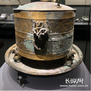 “蜀西工”造金银涂乘舆大爵酒樽有两部分构成:樽和樽盘,它的体积比较大,重9640克,高28.27厘米。樽为平底圆筒形,外壁有两组纹饰带,上面有西王母、奇鸟、羽人等图案,制作非常精美,显示出人们对仙界美好生活的向往。目前我国发现同类型的酒樽全国仅有两件,另外一件收藏在故宫博物院,这件酒樽因出土数量少,工艺精美而成为邯郸博物馆的镇馆之宝。