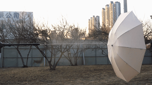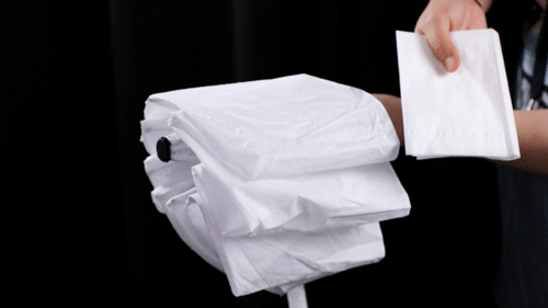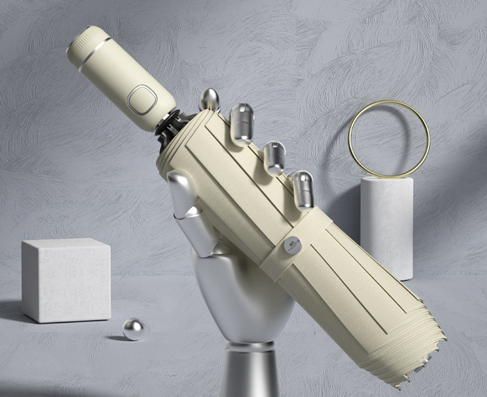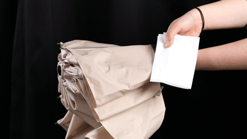 这只骨骼清奇的伞,折叠完毕后,会将接触雨水的一面连着雨水一起牢牢裹住。