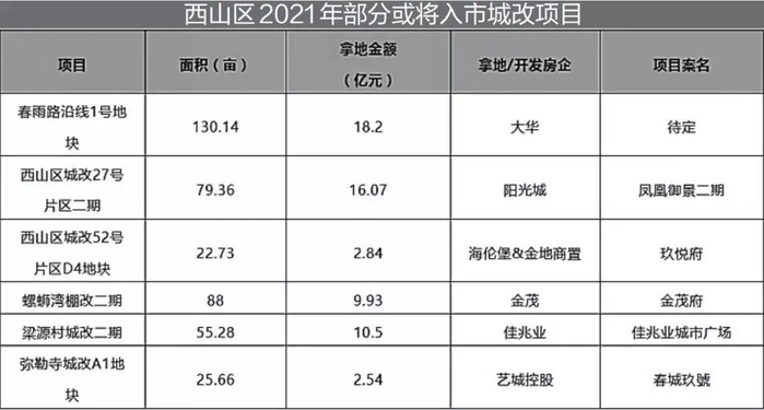 去年年底,西山区迎来多宗城改项目用地的出让,2021年将新增不少新项目。