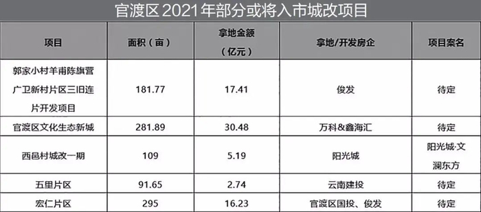 今年,官渡区城改项目10个,约9317亩,已确定开发商5个,开工项目3个。从区域分布来看,城改面积较大的是凉亭、巫家坝、日新路以南等片区。