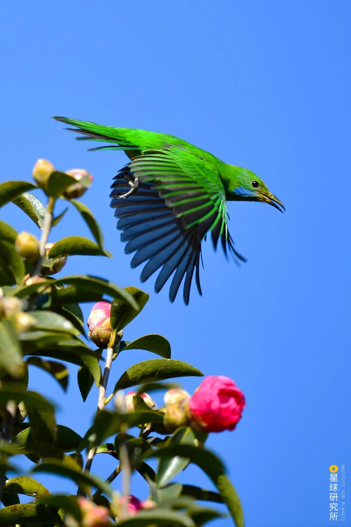 (出自唐朝李白的《咏邻女东窗海石榴》,海石榴一说为山茶,图中为飞过山茶树梢的橙腹叶鹎,山茶开花较早,是亚欧大陆上分布较广的鸟类传粉植物,摄影师@柴江辉)