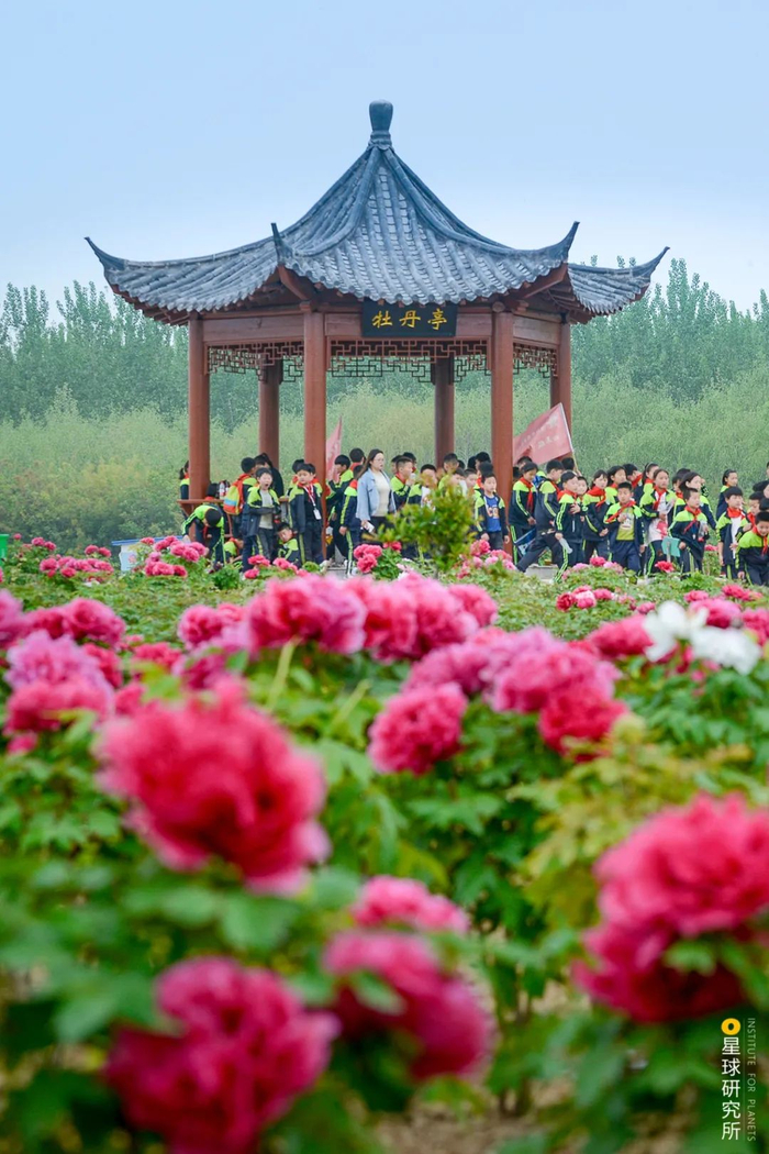 (出自唐朝刘禹锡的《赏牡丹》,图中为一队小学生,在老师组织下春游牡丹亭,摄影师@刘辰)
