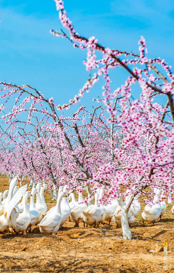 (出自唐朝白居易的《春晚寄微之》,图中为河南周口颍河岸边的桃花,“鹅队”在此经过,摄影师@刘辰)