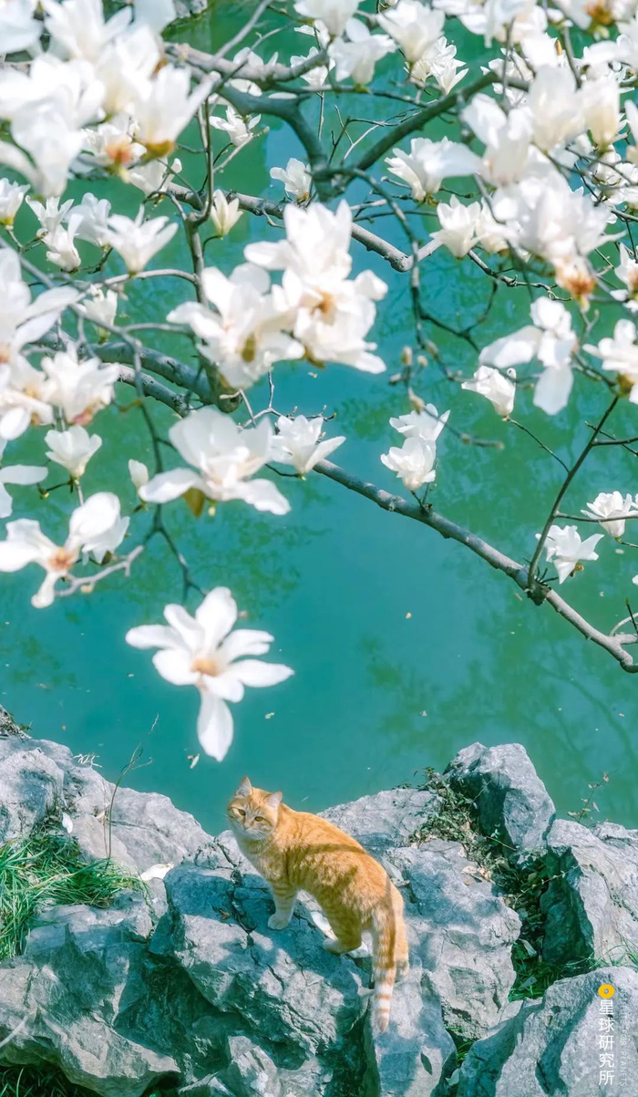 (出自唐朝刘长卿的《题灵祐上人法华院木兰花》,图中为苏州怡园,一只橘猫在凝视玉兰,心有猛虎,细嗅玉兰,摄影师@喵呜不停)