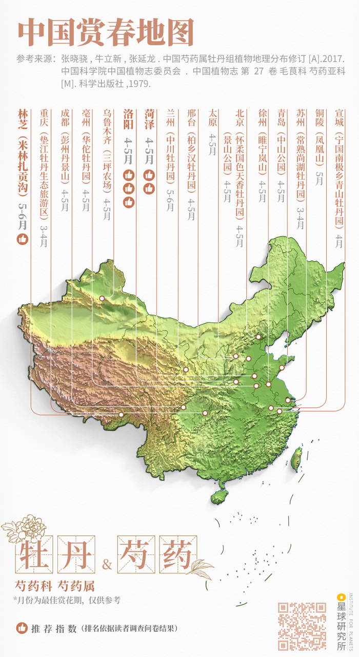 (中国赏春地图⎜牡丹&芍药,制图@郑艺&郑伯容/星球研究所)