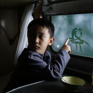 图为《海林都》电影中,小巴根在火车玻璃上画妈妈。 李宗刚 摄