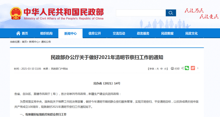 民政部社会事务司继续在清明节期间设立清明节工作办公室,并在清明节法定假日期间(4月3日至5日)安排专人值守,统筹协调服务地方清明节祭扫工作。清明节法定假日期间,地方各级民政部门均应执行专人值班制度和祭扫情况日报告制度。各省级民政部门要在3月26日前报送经省级疫情防控指挥机构批准的清明节祭扫工作方案或通知;4月3日至5日每日15时前统一上报《2021年清明节祭扫情况日报表》(见附件),4月12日前上报本省份清明节祭扫工作总结。