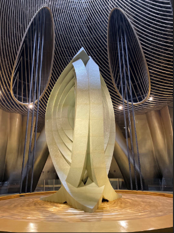 这里的视觉震撼不局限于雕塑本身,还有与雕塑的线条元素统一的建筑内饰,勾勒出犹如教堂穹顶一般的外形,让人仿佛置身宇宙,顿感自身渺小。