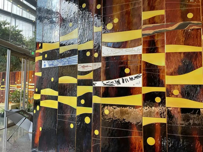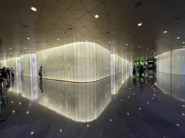事实上,上海中心里不太为人熟知的文化空间还不止于此,仅一楼大厅处,就有覆在墙上的“百鱼图”,走几步又能看到琉璃幕墙上隐约的山水淡墨——如果用手机拍摄模式会更清晰得显现色泽对比。