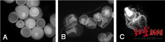 多棘海盘车的受精卵(A),原肠胚(B)和羽腕幼虫(C)