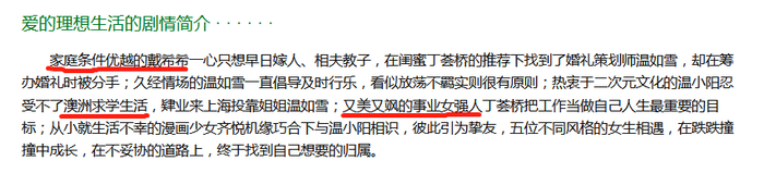 而在《爱的理想生活》里,四个女主“全员富婆”,左手开着婚庆公司,右手当着知名博主,开着豪车空降高管。她们画着精致的妆,住着一尘不染的样板间,吃西餐,喝红酒,搞事业人均霸总,分分钟开挂,谈恋爱不作不死,撒狗血几盆。