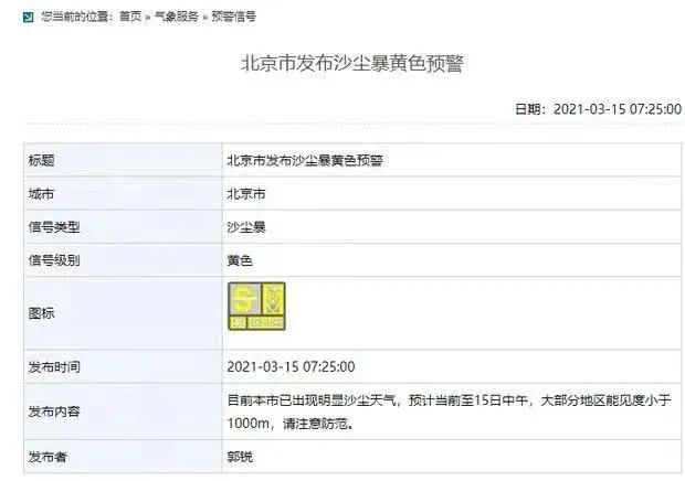 今天(3月15日)早晨,北京市气象台发布沙尘暴黄色预警。此时此刻,北京已出现明显沙尘天气。