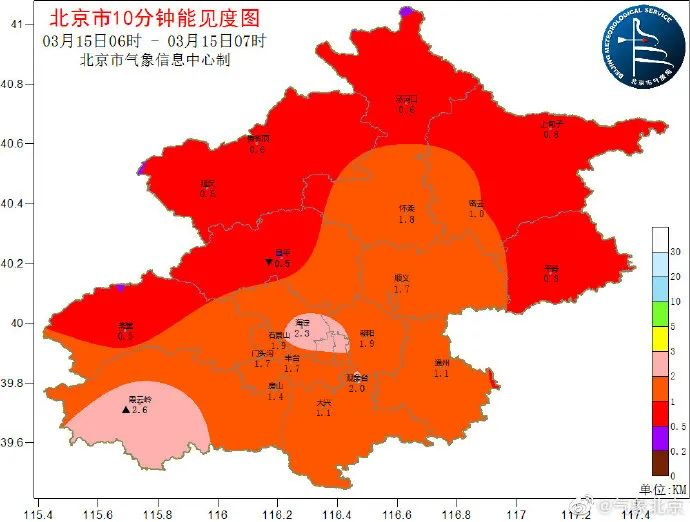 7时10分,目前北京城区大部分地区能见度在1-2公里,北部地区小于1公里,能见度较差。冷空气已影响到北京市西部和西北部,并伴有明显的沙尘天气,未来自西向东影响本市,大部分地区将出现大风和沙尘,预计将持续一天。