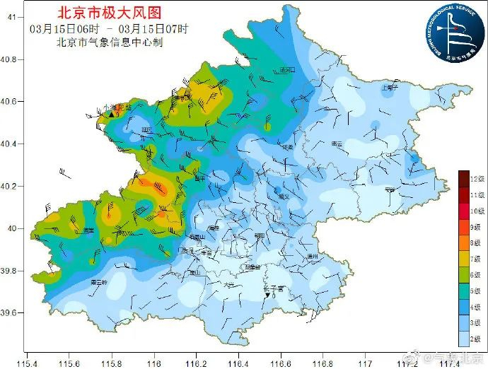 3月15日早上,@气象北京 发布消息称:6时15分,北风已过张家口,到达北京边缘。大风蓝色预警及沙尘蓝色预警中,今天白天风力较大,有沙尘天气,外出注意防范,并远离广告牌等临时搭建物。