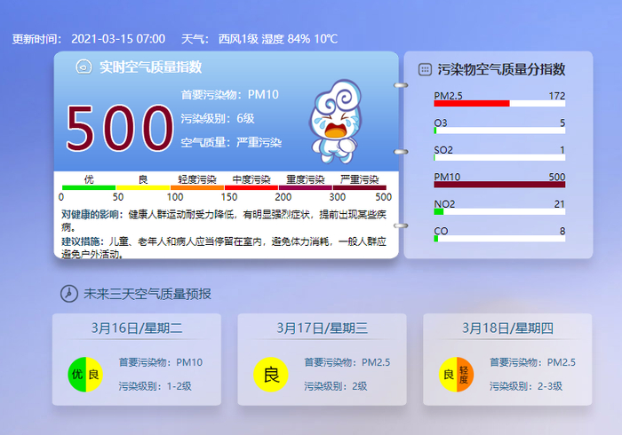 内蒙古巴彦淖尔、二连浩特、包头等地相继发生沙尘暴,能见度低于1000米,PM10指数超过500微克/立方米,西北风6—8级,空气质量等级均为严重污染。3月15日凌晨,沙尘开始影响京津冀地区,北京受上游沙尘传输叠加大风扬沙作用影响,PM10浓度明显上升,PM10指数达到了2153微克/立方米,空气质量为严重污染。目前,沙尘还在继续向东南移动,将陆续影响吉林、黑龙江、河南、山东等地。