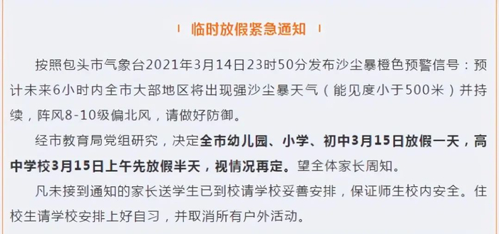 3月15日, 包头教育在线发布临时放假紧急通知: