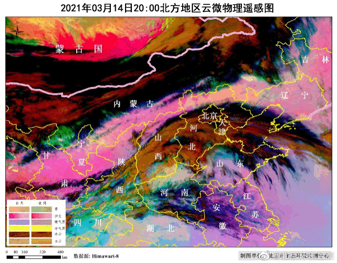 遥感图显示,昨日晚间源起于蒙古国南部的沙尘随气流逐步南下,凌晨3时起自北向南影响北京。
