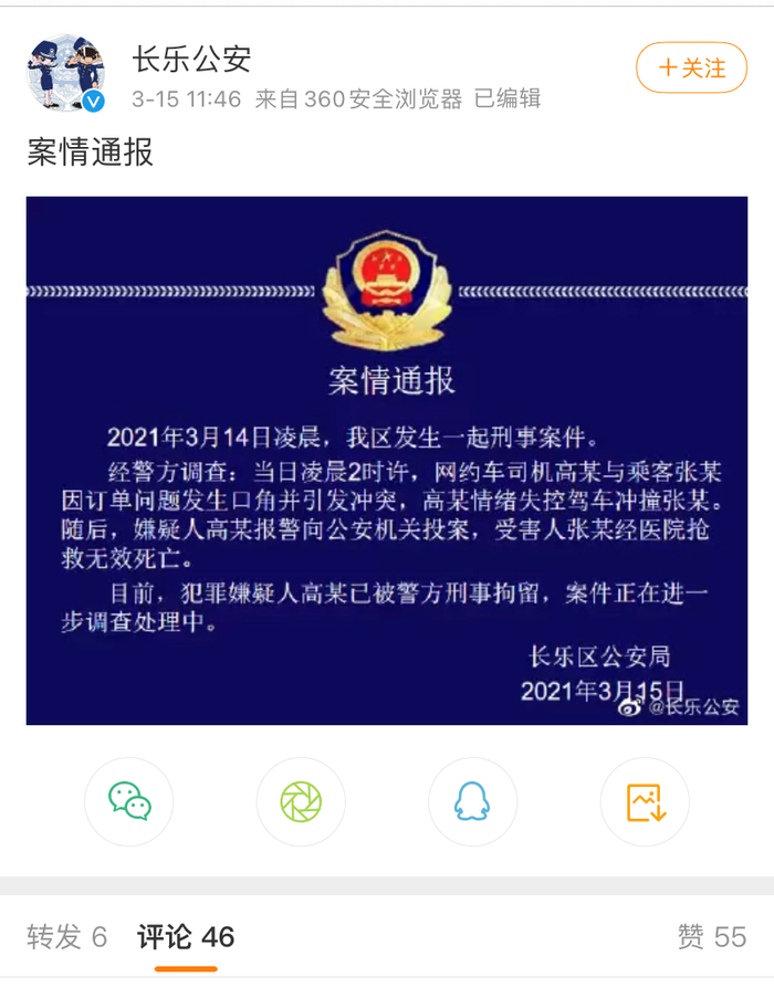 原标题:福州一网约车司机驾车冲撞乘客致死,警方通报!