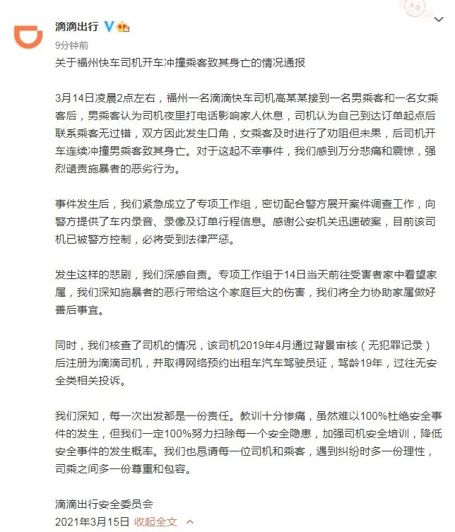 事件发生后,我们紧急成立了专项工作组,密切配合警方展开案件调查工作,向警方提供了车内录音、录像及订单行程信息。感谢公安机关迅速破案,目前该司机已被警方控制,必将受到法律严惩。发生这样的悲剧,我们深感自责。专项工作组于14日当天前往受害者家中看望家属,我们深知施暴者的恶行带给这个家庭巨大的伤害,我们将全力协助家属做好善后事宜。同时,我们核查了司机的情况,该司机2019年4月通过背景审核(无犯罪记录)后注册为滴滴司机,并取得网络预约出租车汽车驾驶员证,驾龄19年,过往无安全类相关投诉。我们深知,每一次出发都是一份责任。教训十分惨痛,虽然难以100%杜绝安全事件的发生,但我们一定100%努力扫除每一个安全隐患,加强司机安全培训,降低安全事件的发生概率。我们也恳请每一位司机和乘客,遇到纠纷时多一份理性,司乘之间多一份尊重和包容。