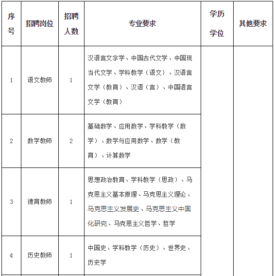 3 | 语文 教师 | 1 | 语言学及应用语言学、汉语言文字学、中国古代文学、(中国)古典文献(学)、中国现当代文学、学科教学(语文)、汉语(言)文学(教育)、汉语言、中国语言(与)文化、应用语言学、中国语言文学(教育)、现代汉语语言学、文学与语文教育、现代语言理论与语言应用 | 本科及以上学历,硕士及以上学位 本科及以上学历,硕士及以上学位 本科及以上学历,硕士及以上学位 | 本科及以上学历所学专业或硕士及以上学位所学专业与岗位要求的专业相符均可 本科及以上学历所学专业或硕士及以上学位所学专业与岗位要求的专业相符均可 | |
