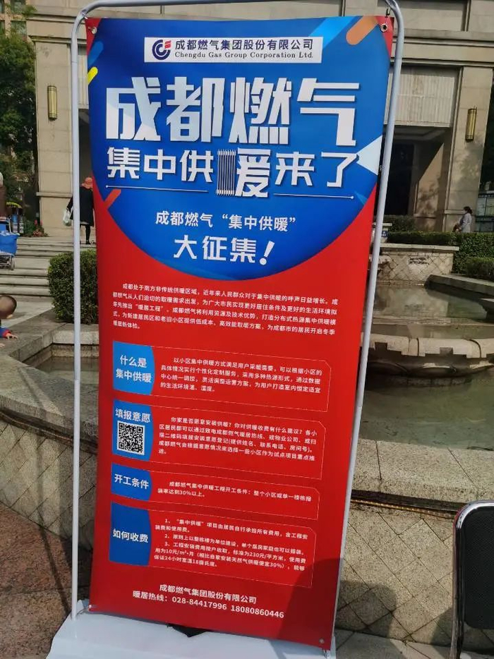 成都燃气集团股份有限公司客服公司零售事业部副经理张涵莉:首先需要自主报名,小区报名人数需超过30%。其次,小区现场需要具备安装摆放公共供暖设备的位置。再次,经过现场勘测后评估出的费用将平摊到各业主。在告知后业主均获得同意后即可实施。