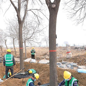 图为工作人员正在对树球进行土壤包裹。人民雄安网 王红/摄
