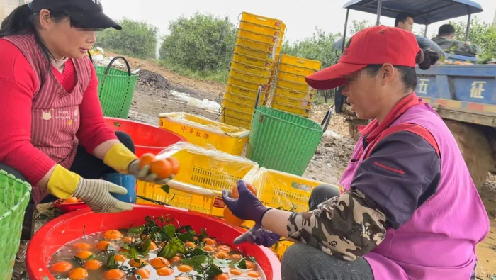 果园内有工人正在用泡过抑菌农药的水浸泡沃柑。