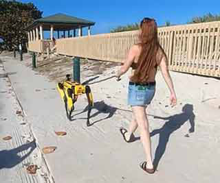 女子在海滩上遛价值49万的机器狗