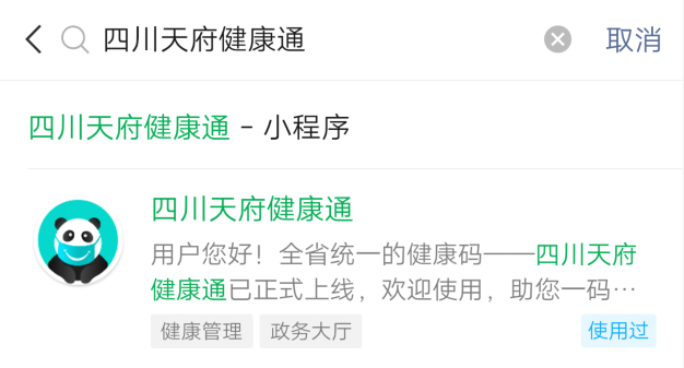 1、进入支付宝或微信,搜索“四川天府健康通”小程序。