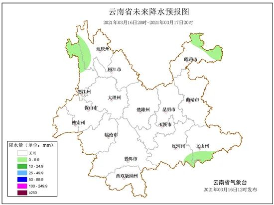 3月16日20时-17日20时:迪庆西部、怒江北部、昭通北部、文山南部、红河东南部多云有阵雨,其他地区晴间多云。