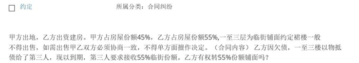 你好。若甲乙双方并未到房屋产权登记机关做产权分割登记,双方关于45%和55%份额比例的约定仍限于合同层面,这种情况下,第三人不能直接要求乙方转让55%份额的铺面。