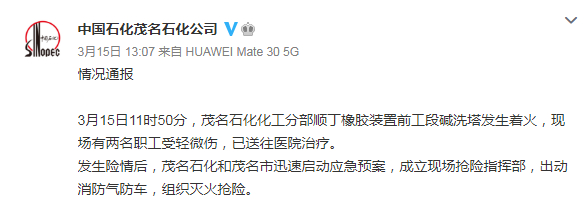 3月15日11时50分许,位于广东茂名高新区的茂名石化化工分部发生火灾。据茂名石化通报称,经紧急扑救,明火已于当天12时50分左右被扑灭。截至目前,该起事故已致一死两伤。