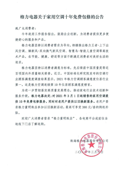 3月6日,格力电器发布公告,宣布对2021年3月1日起销售的家用空调实行“十年包修政策”,从更大程度上保障消费者利益。这是迄今为止中国家用空调行业承诺的最长包修期,也是自2005年格力电器率先在行业推出“家用空调6年免费包修”政策以来对服务品质的再升级。该公告一经发布便引发业内和消费者热议。