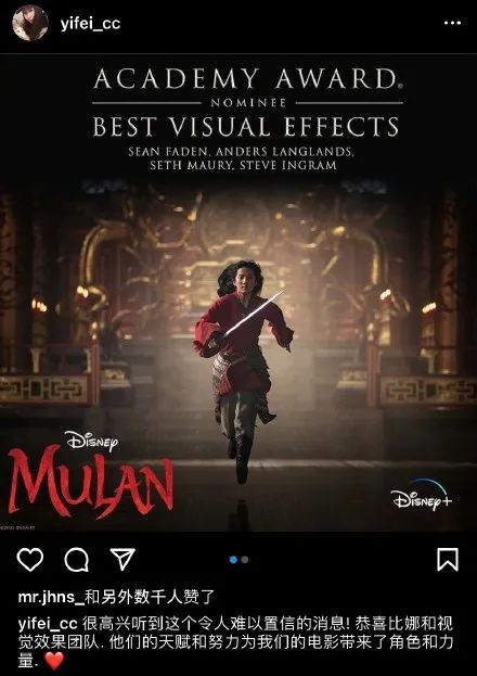●刘亦菲回应《花木兰》提名奥斯卡:令人难以置信