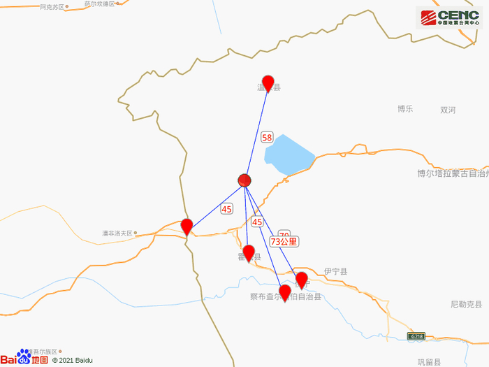 周边县城:震中距霍城县45公里、距霍尔果斯市45公里、距温泉县58公里、距伊宁市70公里、距察布查尔锡伯自治县73公里,距可克达拉市59公里,距乌鲁木齐市547公里。