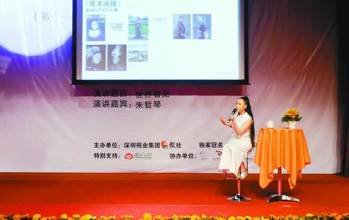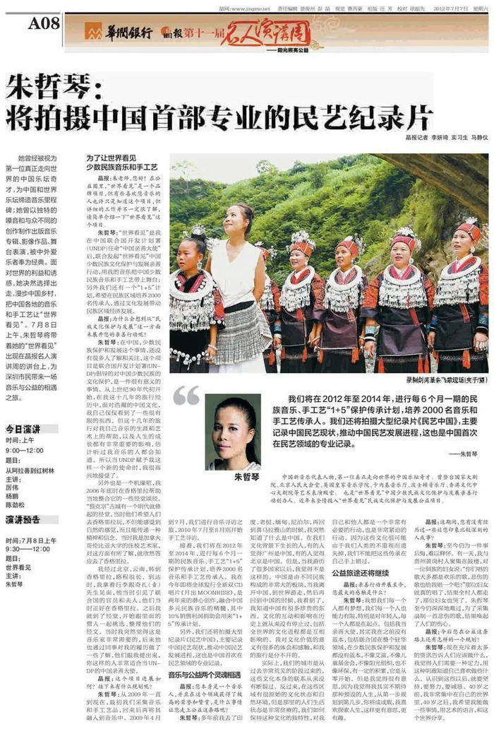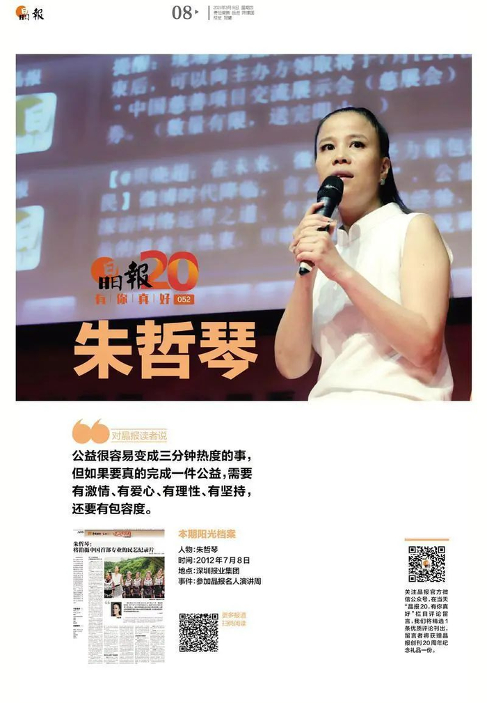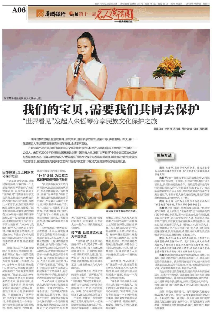 2012年7月8日上午,作为第十一届晶报名人演讲周的嘉宾,朱哲琴一袭纯白棉布旗袍、黑发高束,带着她的“世界看见”出现在讲台上。在短短两个小时的时间里,这位有着新音乐文化先锋名号的乐坛奇才,向人们展示了她的另一个身份——公益人。